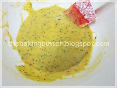 When the batter is well folded, pour it into a chiffon tin. Shake the tin a lil' to release big air bubbles trapped in batter. Bake cake for 60 minutes.